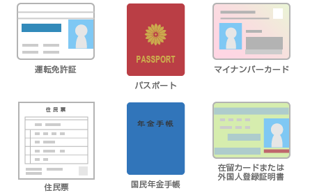・運転免許証、パスポート、マイナンバーカード、住民票、国民年金手帳、在留カード等